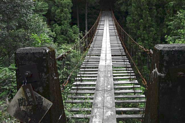 この辺りにはこんな風なつり橋があっちこっちの谷によくかかっている。かつては暮らしに欠かせない道だったが、集落がそっくりそそのまま消えてしまったいまでは行き交う人もほとんどない。猪を撃つ猟師や登山で山をゆく人たちや、あるいは山の仕事をする人たちがたまに通るだけなんだろう。
